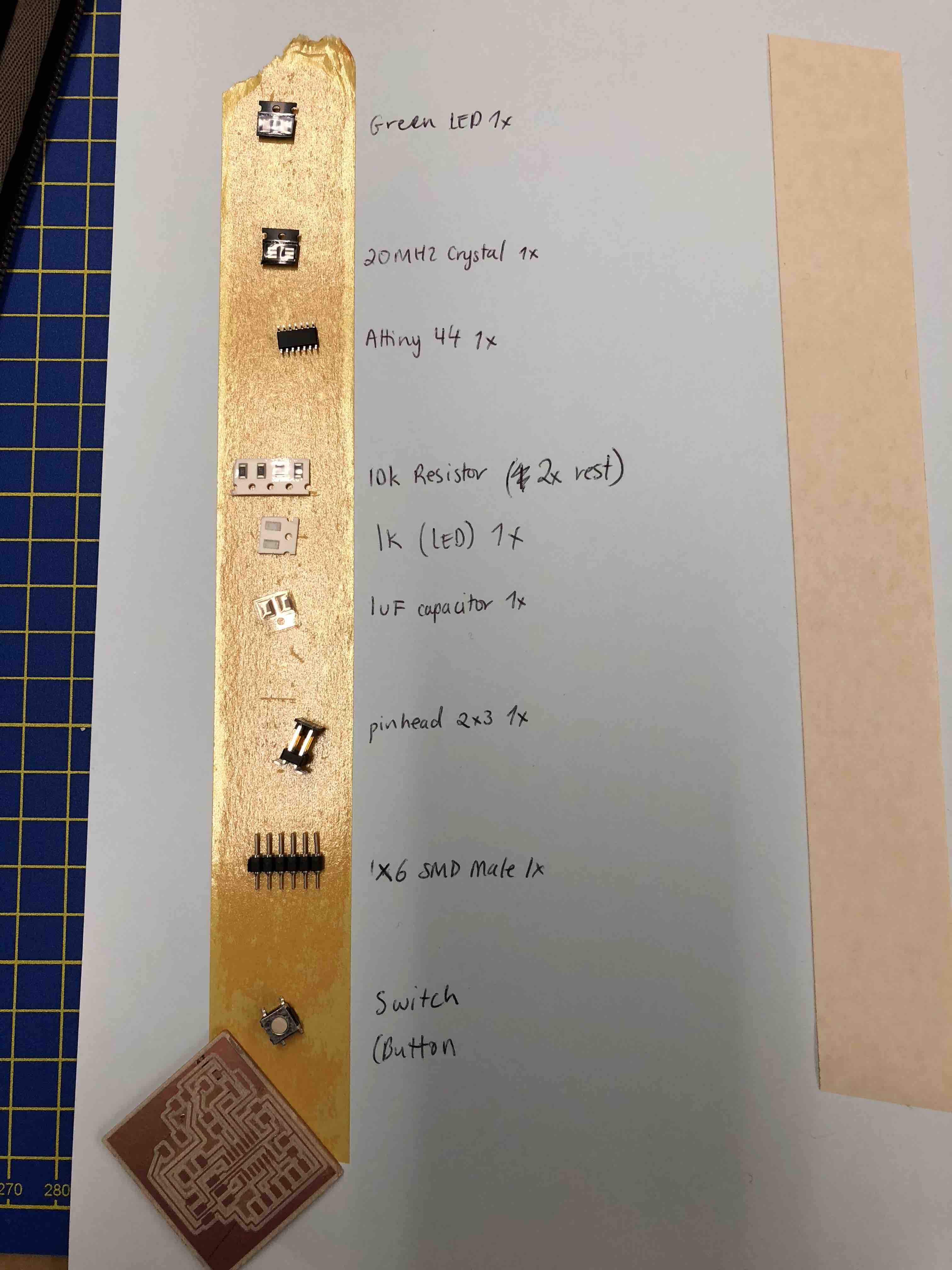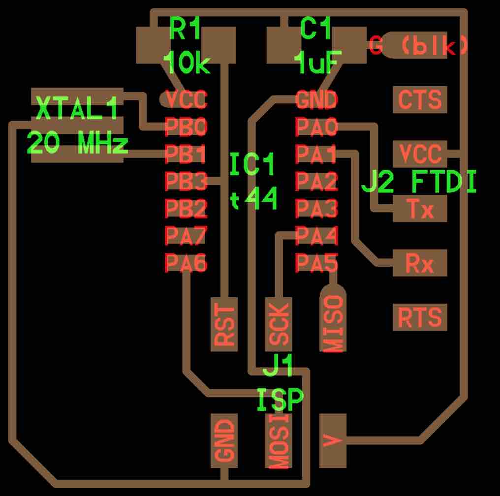 I then decided to delete the connections of the extra components in my schematic and first focus on connecting the inital components - the capacitor, resistor, attiny 44, pin head 2x3, my 20MHz crystal and my 1x6 SMD Male. This made the work flow much easier because there was less to look at. It was after then connecting it that I reconnected my LED and my switch in my schematic, and then added them in where there was appropriate space afterwards. I first had everything spread out so that it was clearer for me to see what was happening. After everything was hooked up properly, I looked into compacting my board so that I would use up as little space as possible in order to "maximize" space and not waste my copper board.
