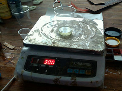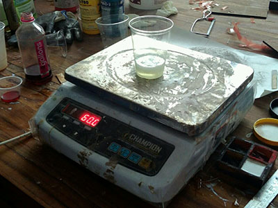 Step 3 Mix the Smoothcast 325 Part A and Part B in equal amount by weight here we are pouring 30 gm of A and 30 gm we put compound A first for this place empty glass and zero the scale than pour 30 gm material