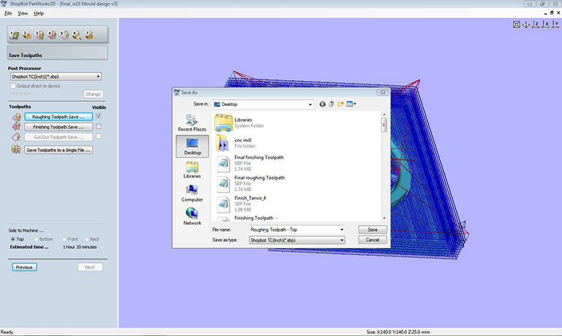 For 3d milling on shopbot we need .stl format file which we import in Partworks 3d software which will generate toolpath based on the geometry of file
