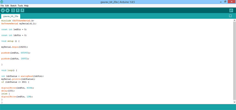 we need to read value of ldr on serial monitor for which we assign the pin 6 and pin 1 to rx and tx correspondingly and connected this pin to the rx and tx pin of ftdi cable at serial port