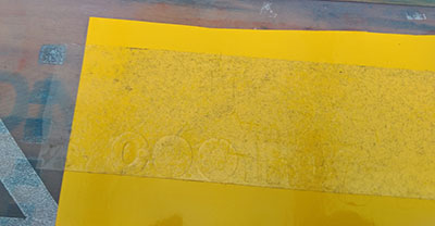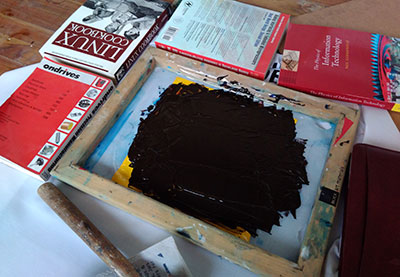 2 spreading color on screen i used black ink for printing , here you see the letter c and G are not proper because surface below this is already dried by white color so the pores are closed here , as i am using it for learning the process so used old screen available in our lab