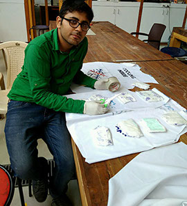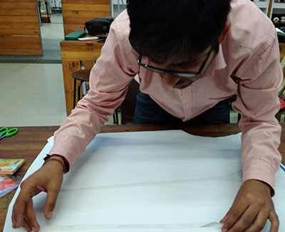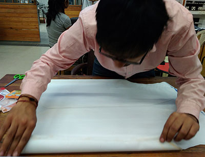 As it was written in our instruction that Although there can be manual processing steps, to count as digital fabrication the Work flow should pass through design in a computer and some kind of automated output process. but hand-stitching them wouldn’t so i used laser cutting for cutting cloth and vinyl cutting for screen printing and i stitch them using fabric glue which is standard method of fixing cloth together as i have given border in sides so i fold them and fix it as shown in figure also we don't have any digital fabrication technique for fixing cloth in lab so i used this