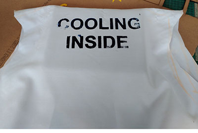 this will made by laser cutting cloth and stitching it ( here i fix it using fabric glue) and screen printed on front an back to give cool look and it is stuff with hydrogel pads, actually hydrogel have more water retaining power than its weight and it will not wet the surface also which i am using making my jacket