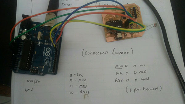 Here i use Arduino for programing my board this 10, 11, 12 ,13 are pin on arduino board are programing pins and the pins of 6 pin header are in same order as shown in diagram connect respective pins having same name.