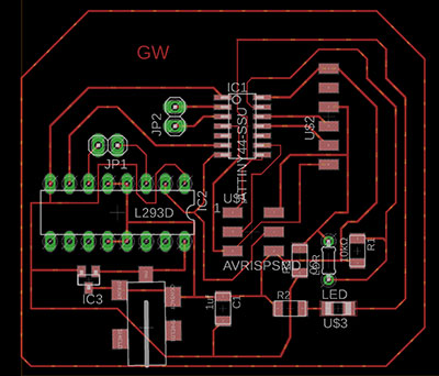 In this board the green pads are for through hole component, i have connected motor for output which is to be connected at jp1 pin header ,i connect 5.5 v voltage regulator so it will supply power to all other component in circuit which are operated at 5.5 v 0r less than that .