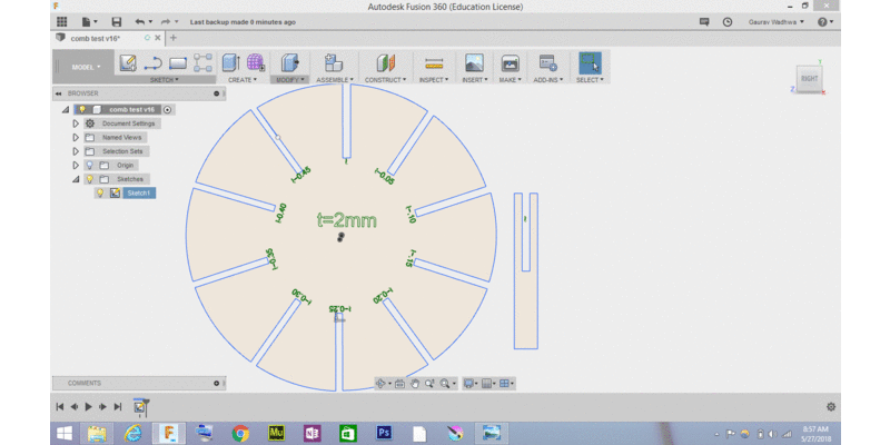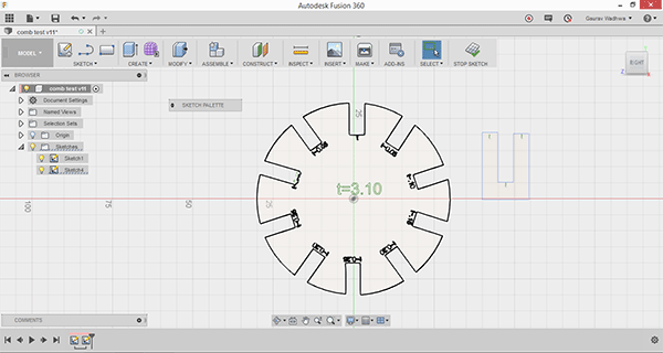 we are asked to make comb on different material and of different thickness so i try to make comb which is parametric and one can use this to test on any material of different thickness so i designed parametric comb i tested this on two material acrylic of 3.10 mm and MDF board of 2mm