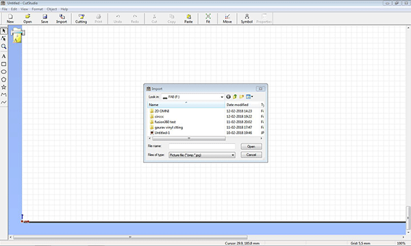Step 1 : it is to load image in cut-studio ,the image is drag and dropped in the cut studio window or you can import using import option in file menu bar