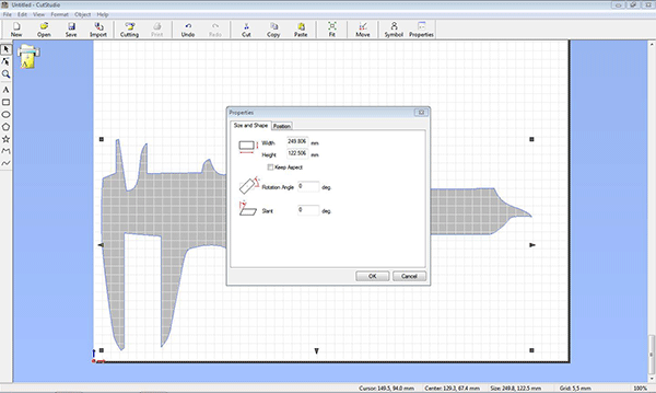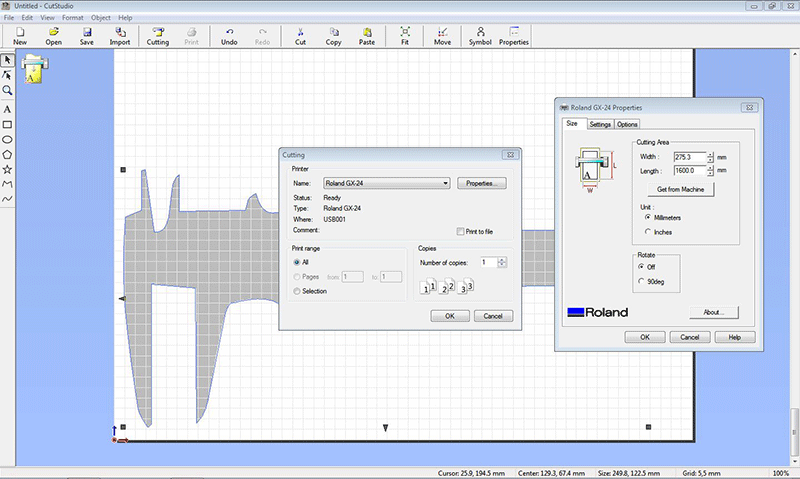 click on the cutting option on the top , go to properties , you will be asked for width and length if you are not sure click get from machine and set units in mm/inches and rotate setting to 0or 90 degree than click on okay , machine will start cutting