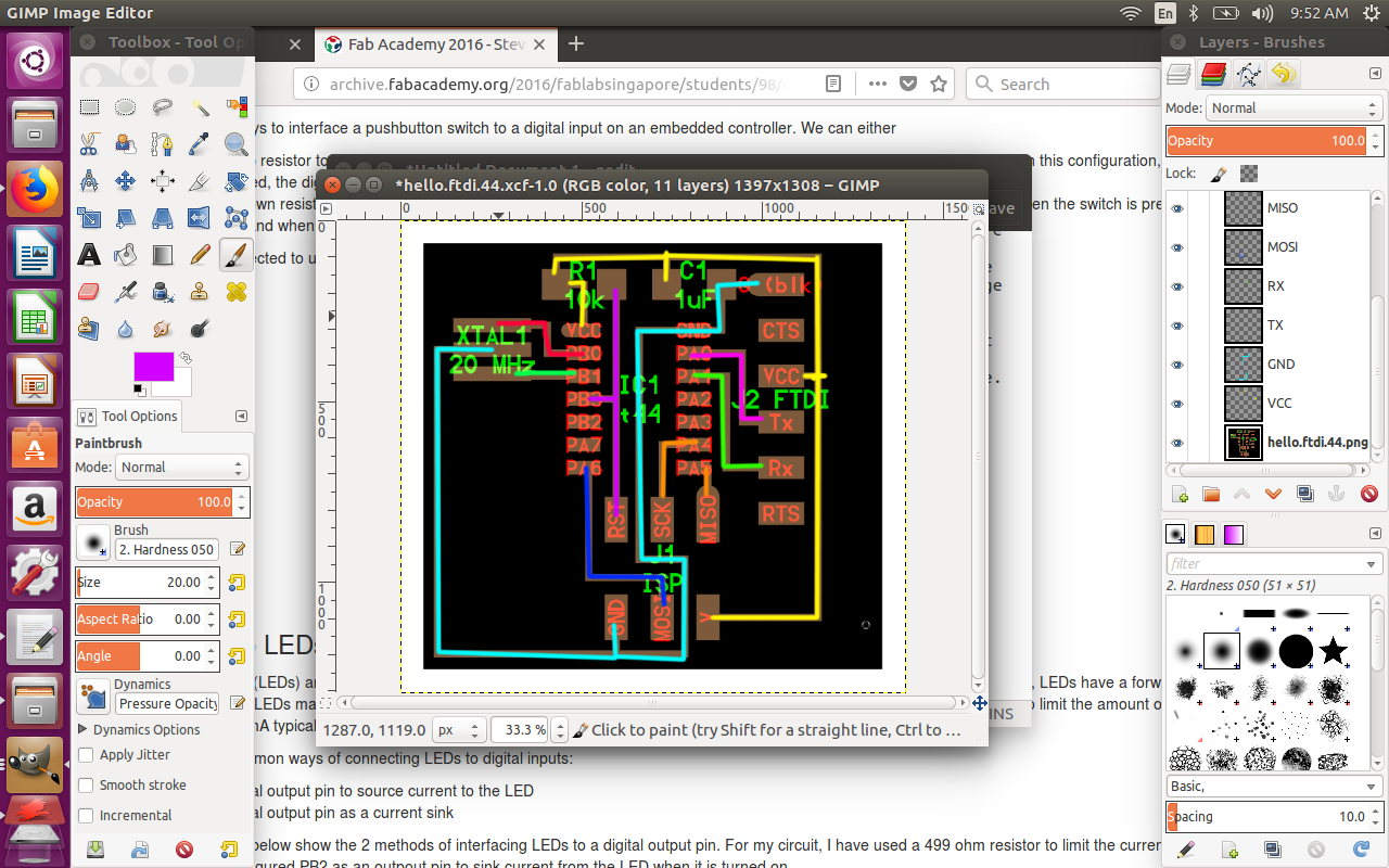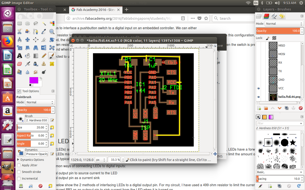 The first step was to download the board preview for hello FTDI 44. In GIMP, I created a new transparent layer named VCC. I traced the connections on the board preview with a distinct color. I repeated that process for all layers. These are the descriptions of the connections from the ATTiny44 datasheet: