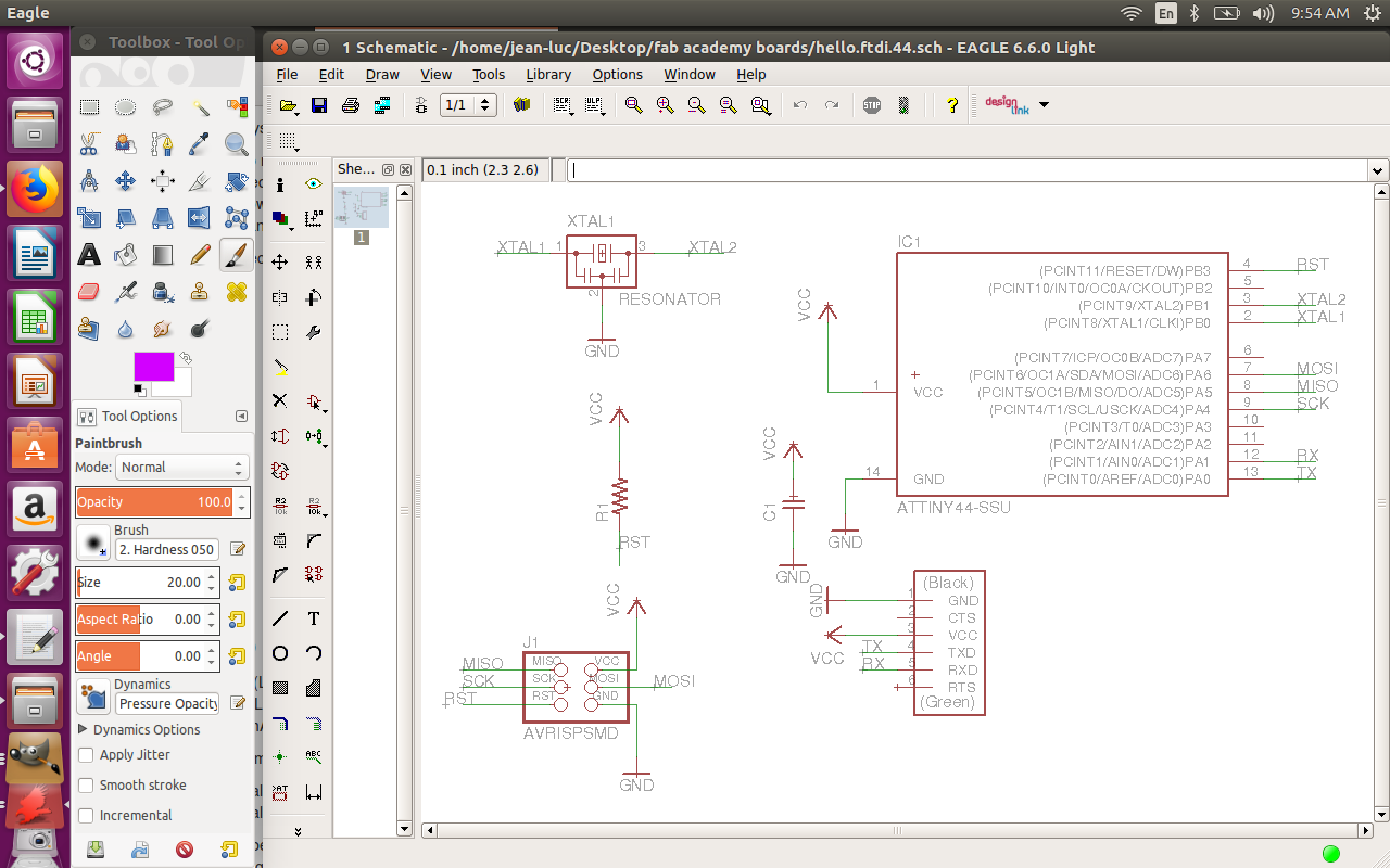 I cloned the FabAcademy Resources repo from GitHub. When I opened Eagle, I added the path to the downloaded lbr and dru files. It's important not to replace the default paths in Eagle, as symbols are needed from the included libraries.