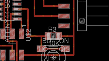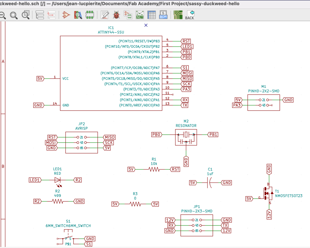 I had a couple of design constraints. At Beach Lab, there was one board of single sided FR-1. I worked in KiCAD to design the board. The concept of the board is something that would be usable throughout the project. I used an ATTiny44 for the microcontroller.