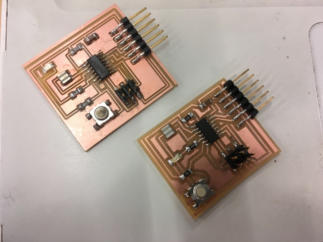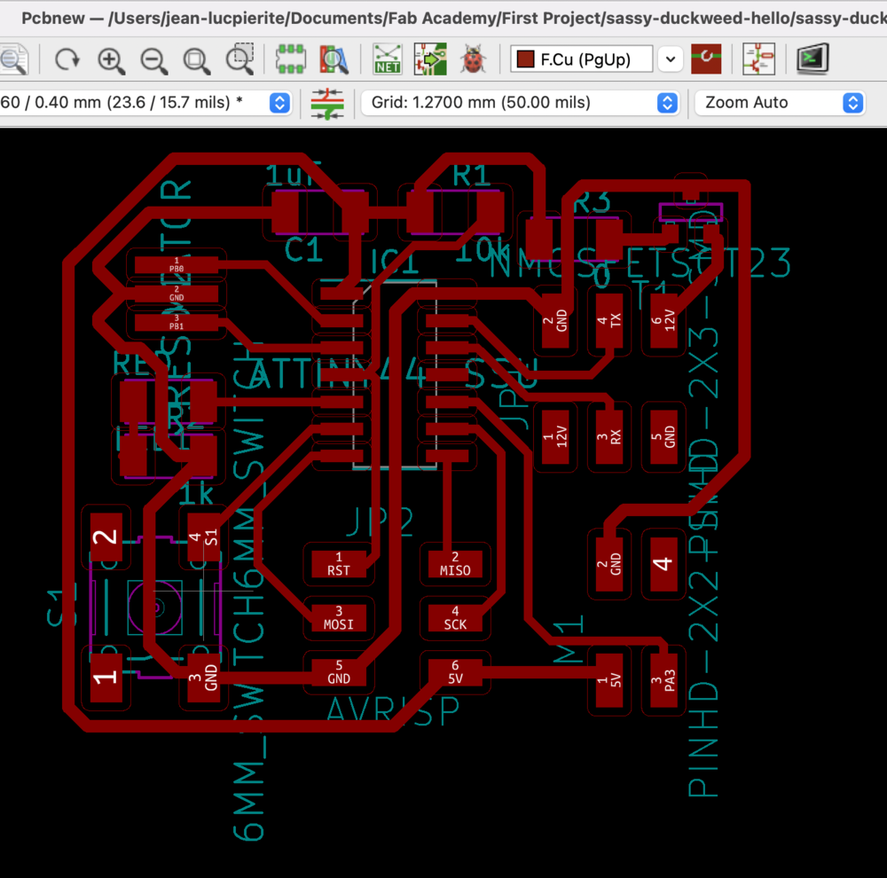 I found a couple of YouTube videos to walk me through the copper pour technique that Steven used. Once the Design Rule Checks were passed and there were no more airwaves, I exported the file for milling through FabModules.
