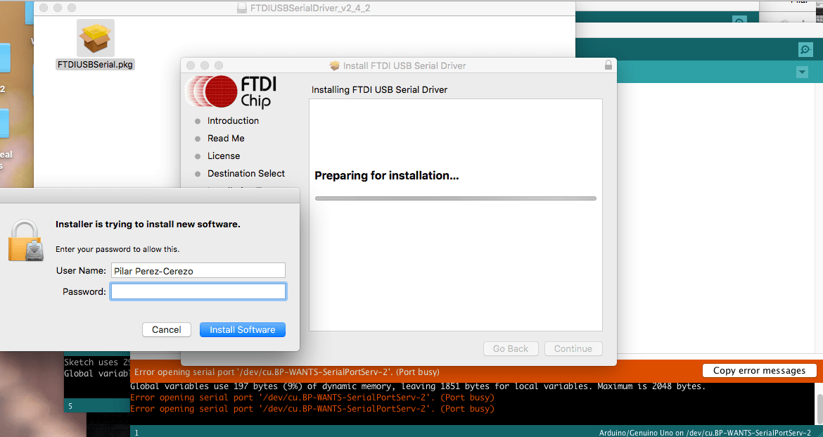 One problem that I ran into was the same as the previews week. My serial monitor was showing up the same problem. It cape appearing something like port busy. So I realize that the FTDI libraries were not in my computer anymore. So that Solve one problem.