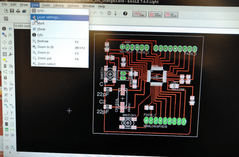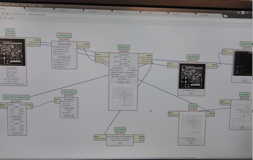 To cut my file on Mods so I click on open programs → open server → rolland mill → srm-20. Then a window like this will appear follow the boxes. Load png file, mill traces then prepare the machine select your X your Y and your Z. Your X and Y depends on where you place your material on the sacrificial layer. Then your Z you lower the head and then free the drill until it touches your material now you are ready to cut. Click on calculate and finally send and this will send it to the machine. Now my board is cutting. Had to cut my Satsha Kit like 6 times because the traces will ripoff. The way I solve the problem was I kept trying with different settings until it did it. I change the cut depth, the diameter of the tool and how many time it was gonna pass on the traces.
