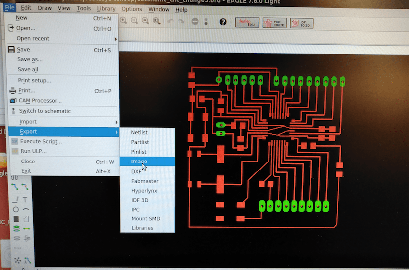 Finished designed my board. First I clicked on the export option, second click on image and thirdly a box will come up with options. The box is called Export image choose where you want to save your file, then monochrome and 500 dpi.