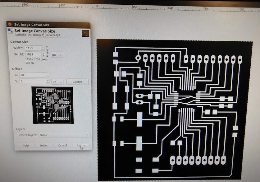 I opened my board in GIMP. So now I just cropped close to the traces but not so close. Then I click on the option image then set image to canvas size. In the window that it appears click on the chain and Neil recommended to add 20 px. We add 20 so we can make the outside trace. Then I clicked on canter and finally do resize. Lastly clicked on flatten image. Then it will fill the outer edge with that's the extra 20px that we add.Then to make the picture for the outer edge, I choose on the paint option to fill in whatever is white is it can be fill on black because the color black the machine does not mill it only the white. Then to save the picture to png I clicked on the option file export and then you select png.