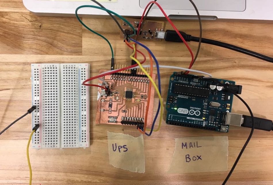 So here I connected my UPS with my MAIL BOX 1 is board 8, in my code says everytime I send you “you” board #8 should hear me if the board got my message then display the number I tell you in my screen. Connections between my satshakit and my arduino. Ground goes to ground in both boards and then pin #a4 and pin#a5.