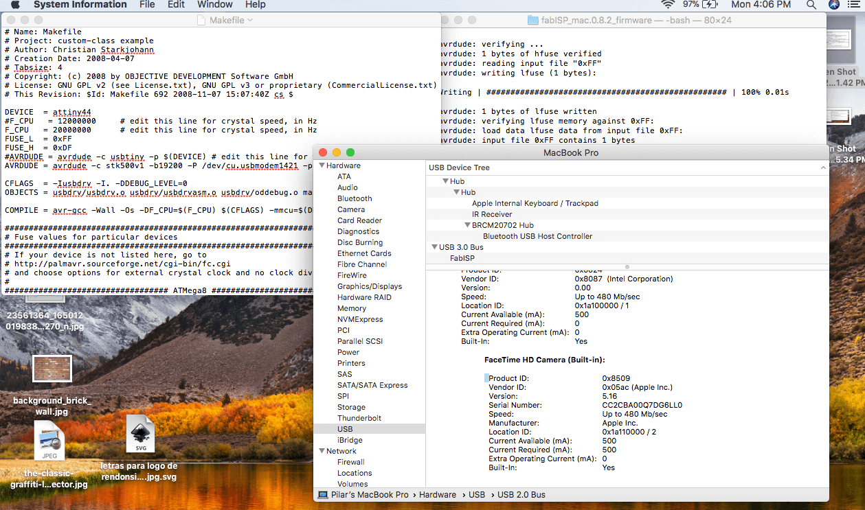 Programming the ISP;I programmed my fabIsp with another fabIsp.So to program my ISP I used cross pack because I have an apple computer. So Once I downloaded all the the files that were necessary. Then I opened this specific file the make file and it was this specific line that we need it to change in the make file. Then once all your connections are good you open your terminal type make clean then you will get a message. After that do the next command make x If you are successful - you will see this response from the system. Then type make fuse if you were successful with that do the next command make program. In my apple computer I went to Click the "apple" menu in your main toolbar → Select "about this mac" ---> Select "more info" --->Under the "Contents" menu in the left hand navigation --->Click "Hardware" to expand the hardware menu (if not already expanded) ---> Click "USB" ---> Under the "USB Device Tree" -----> Click "Hub" to expand the hub menu (if not already expanded) --->"FabISP" should be listed in the hub menu. Yes is showing in my picture.
