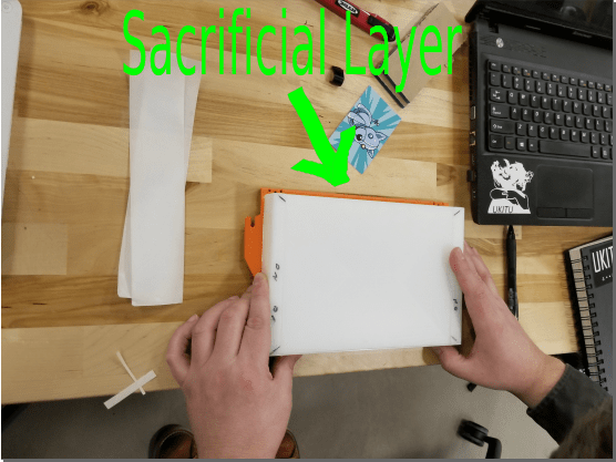 Sacrifice layer of the machine: what you put on top of the machine in order not to break the tool. It is located on top of the work plate to protect the tool. Also the Sacrificial layer needs to be level, otherwise when you are cutting your circuit it won't cut the deepness to the same level.