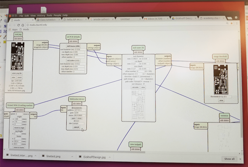 I follow the same steps as before, only some few steps changed. In the machine now I'm using a 1/32" bit for the outline of the circuit board. I used MODS, http://mods.cba.mit.edu/ to mill my board. Mods is an online server that communicates with the machine. Once you go to the web first you choose the option (programs) second (open server program) there it gives the option to choose which machine you want to use. The machine that I’m using is the (SRM-20). Once you have selected the machine the window of options will appear.