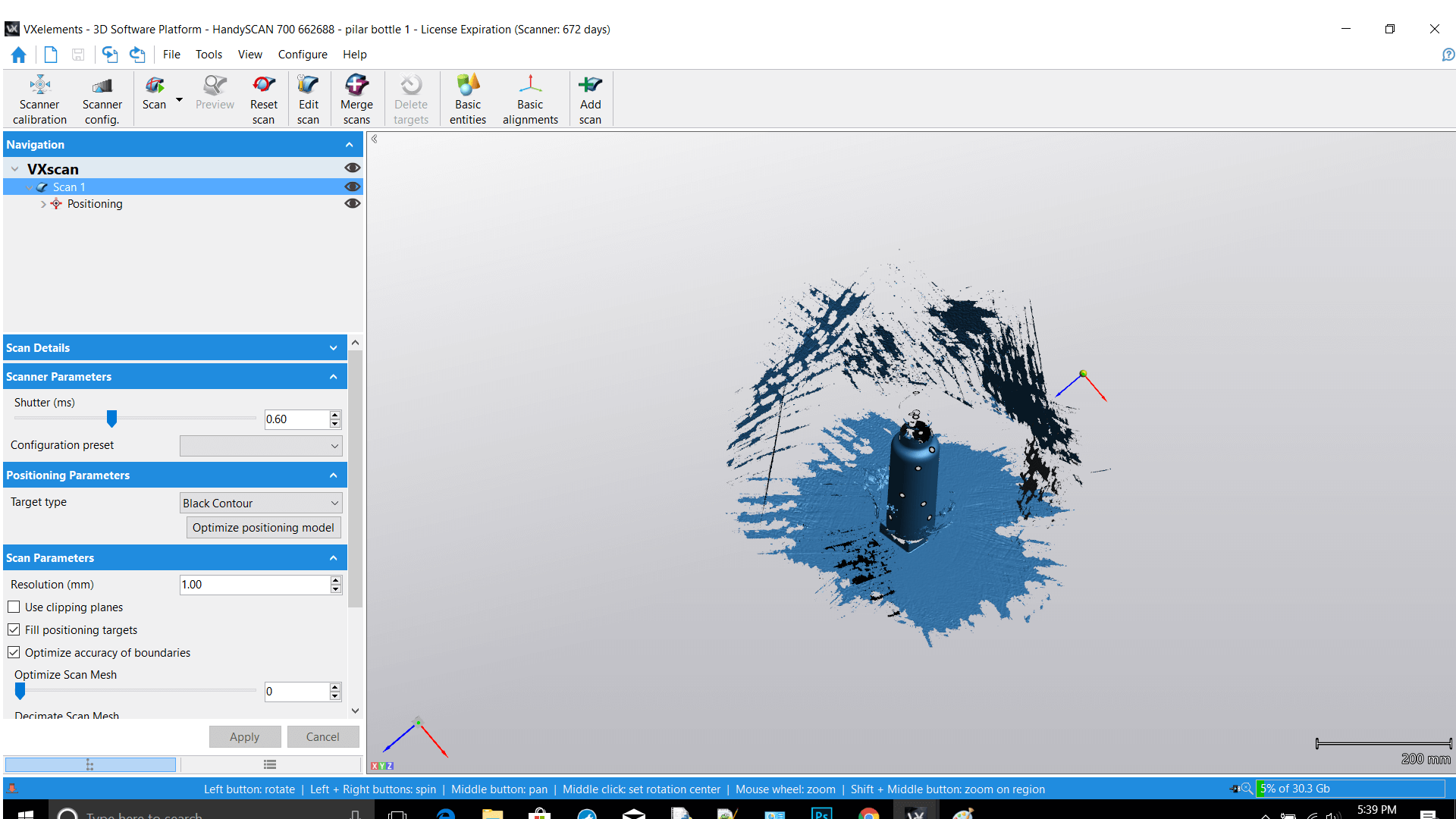 This is how it looks like when you open the window to scan your object. In this program you can also edit your object or you can combine different scan’s. Now you can choose the option to scan in the menu now you can start scanning. You have to attached the position targeting tape in order for the scanner to recognize the object.