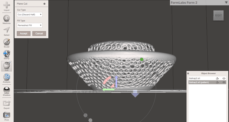 To cut the edge you click on edit, then plain cut. Plain cut allows you to cut a piece of your model to make it flat. Just like the picture is showing. Now my file is ready to print. Save file as STL.