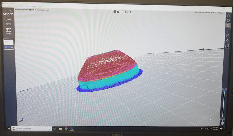 The 3D printers that are available in our lab are makerbot, ultimaker, formlabs and sindoh wox dp 200. At first I try to print my file like 3 times in the makerbot, but it did not work out. I think it did not work out because the supports weren’t strong enough to support the small partters that my object had. After a couple tries I decided to used the printer that Neil recommended during class the sindoh printer. I load my file on the sindoh program. The red color is my shape and the blue color means is the support for the shape.