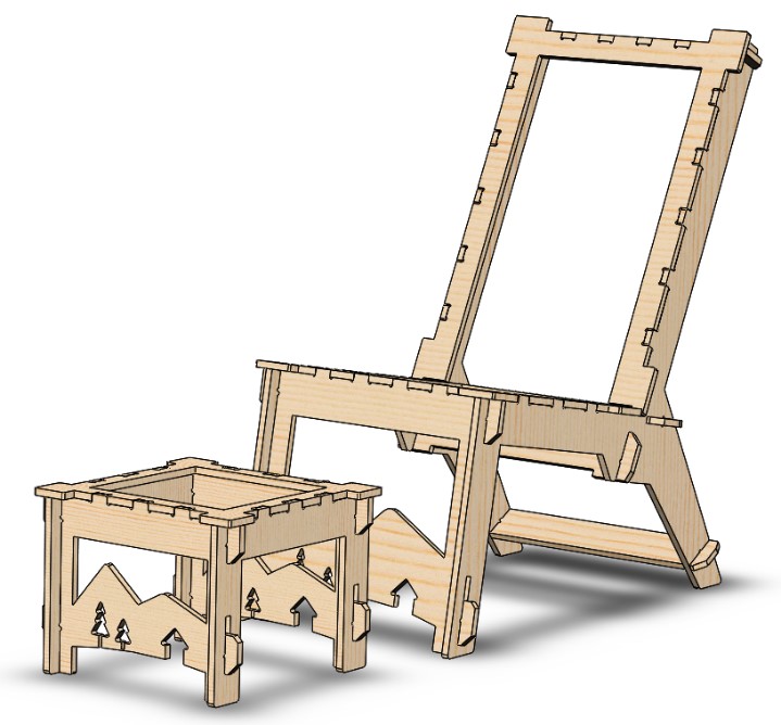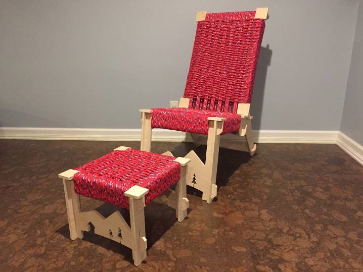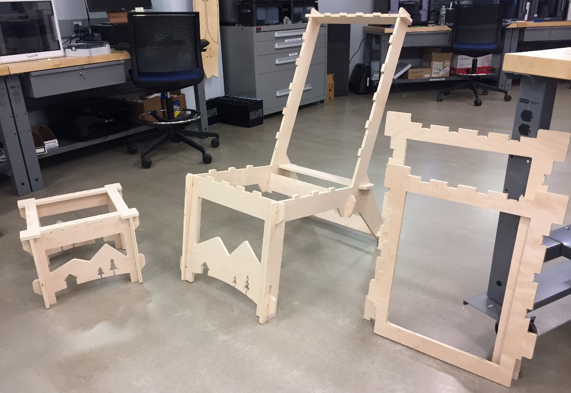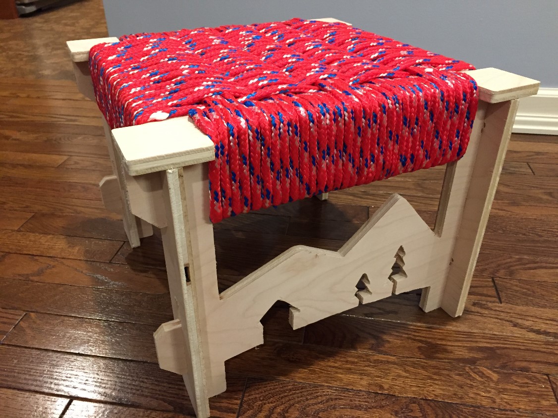 I've been looking forward to this week since the class started! My wife has been asking me to make her a stool that she could keep at her desk so visitors have somewhere to sit when they come by. I started designing the stool, but wanted to do even more, so I designed a chair as well. My goals were to incorporate a woven element into each design and to size them such that both would fit on a single sheet of plywood.