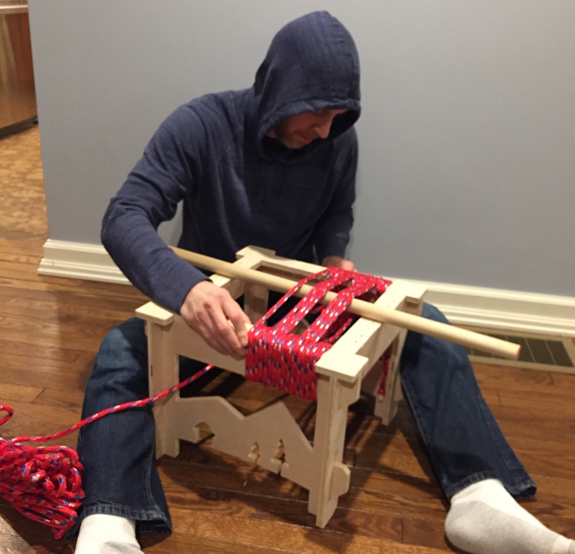 Then I took the assembled furniture home and began the process of weaving the comfy surfaces. It turns out that it's pretty easy to learn the basics of weaving, but I found it quite laborious and time consuming to work the rope through each piece. This is me weaving the stool: