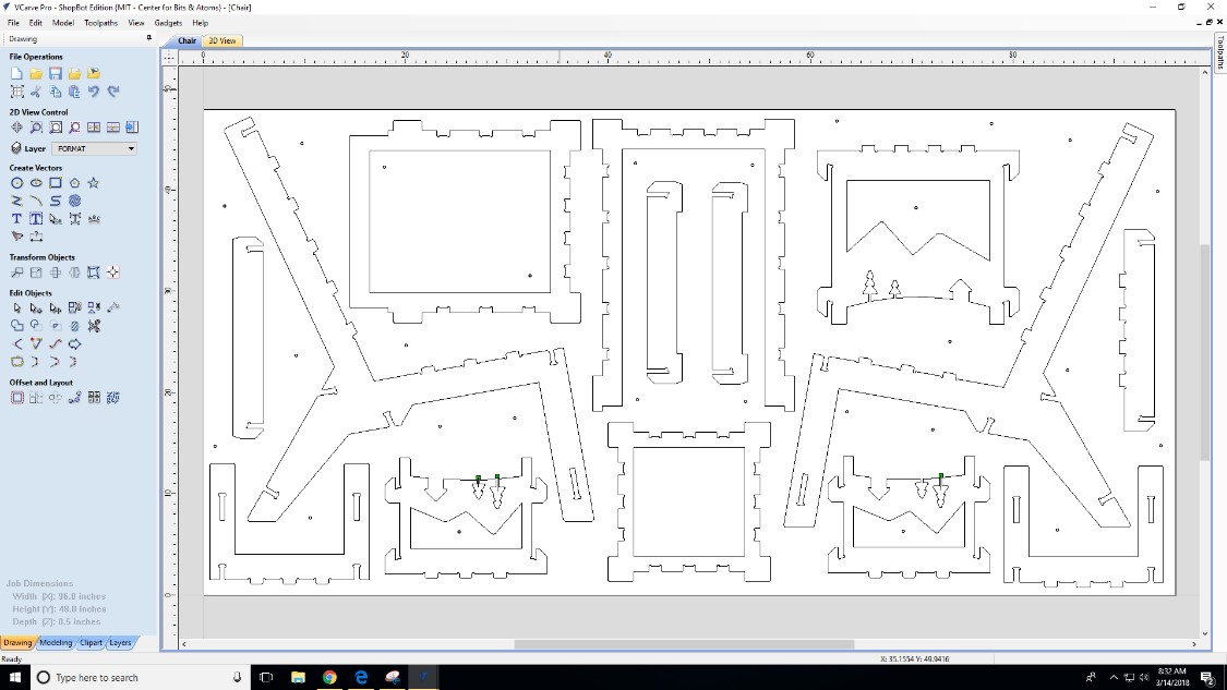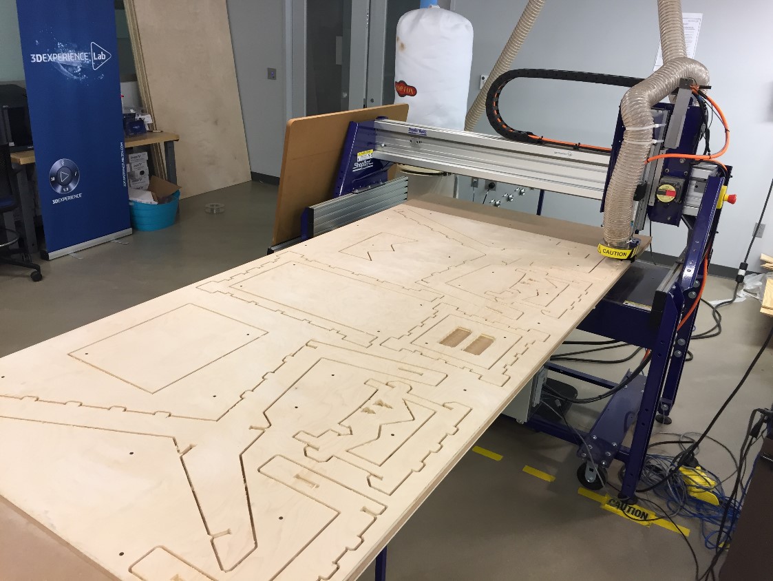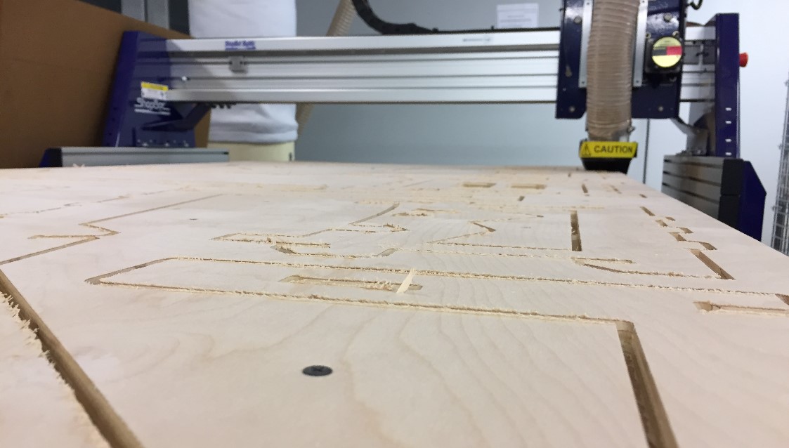 I repeated the process and generated toolpaths for the other shapes. I stared with the inner profiles, and then defined the outer ones. I placed tabs on the outer loops to ensure the pieces stayed firmly attached to the sheet while the cutting progressed. As before, I saved the toolpaths as one job and ran it on the Shopbot.