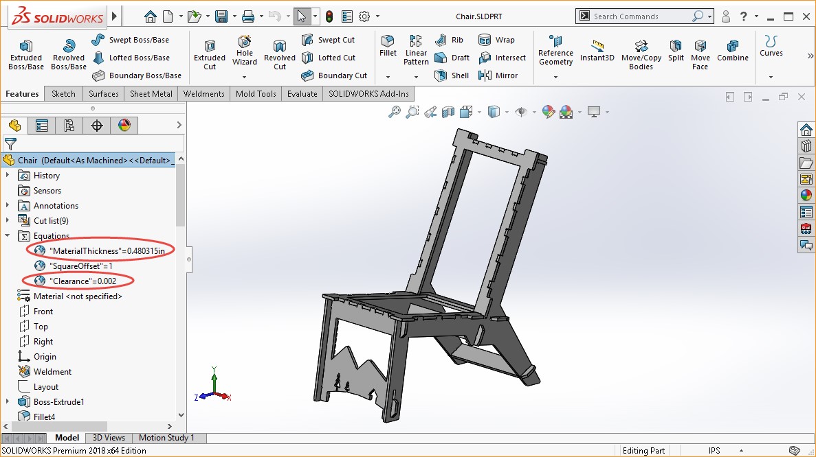 I used SolidWorks to design both models and establised a few key global variables that I could use to vary my design. Of particular interest were the "Material Thicnkess" and "Clearance" variables to which I tied all relevant dimensions.
