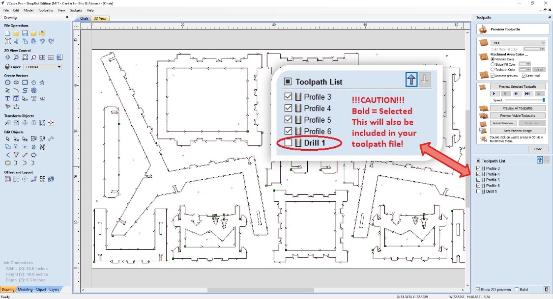 I quickly pressed the kill switch and then inspected things. Thankfully, I didn't break the bit, but I surely dulled it. Turning my attention to my toolpath file, I tried to figure out why it included the drill locations. I knew I had only checked the inner and outer paths for inclusion in the toolpath file. It turns out that VCarve will include both the things you have checked as well as the item you have selected (the one in bold).