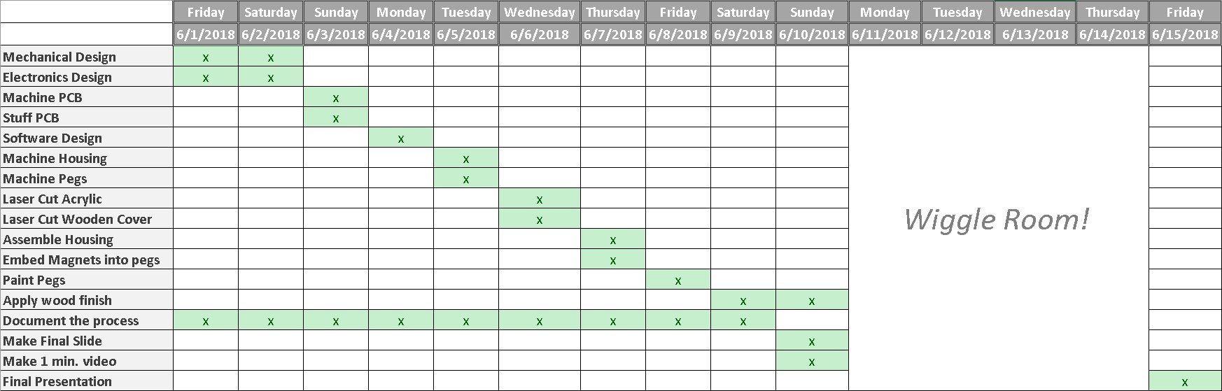 I have 17 days to finish my final project, as I will present it to the FAB Academy on June 18th. To accomplish this feat, I will adhere to this schedule: