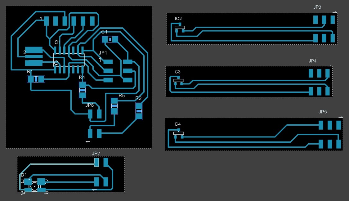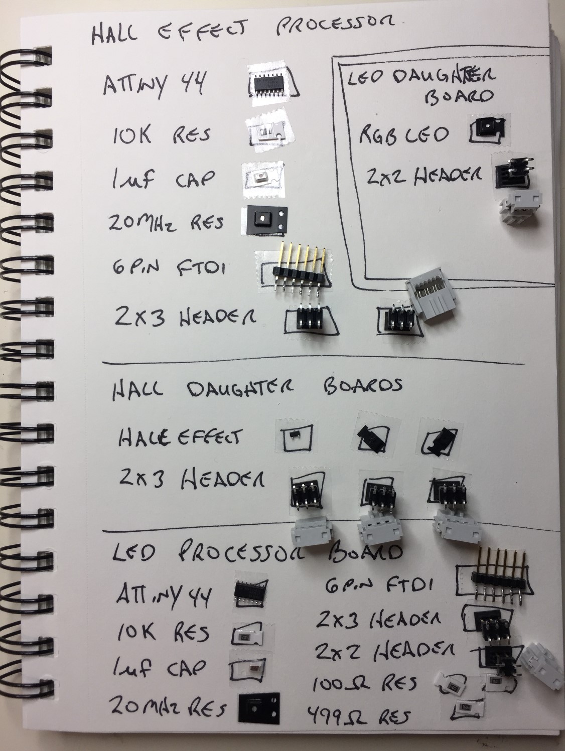 In the early phase of my design, I actually had a 6th board. It had a second ATTiny44 microcontroller that I planned to use to read the hall effect sensors. It was then going to communicate with the ATTiny44 on the LED board via a Serial Bus. I had each board communicating to the Serial monitor quite nicely, and I even had the Hall Effect board sending simple insructions to the LED board to control its lights, but when I added in the Hall Effect data, the serial communication failed. I suspect it was because I was sending the wrong type of data, "int" vs. "char" vs. something else, but I was unable to get one to effectively speak to the other.