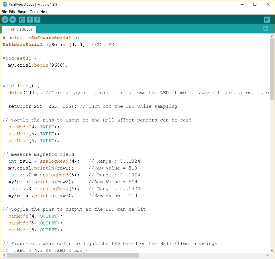 At this point, I have proven that I can build printed circuit boards that contain Hall Effect Sensors and LED and thai I can write code to read and react to input from those sensors. What I have left to do now is package a PCB into the correct form factor for this project and then design a pleasing mechanical system to house it. I'm confident I can do this in the remaining time.