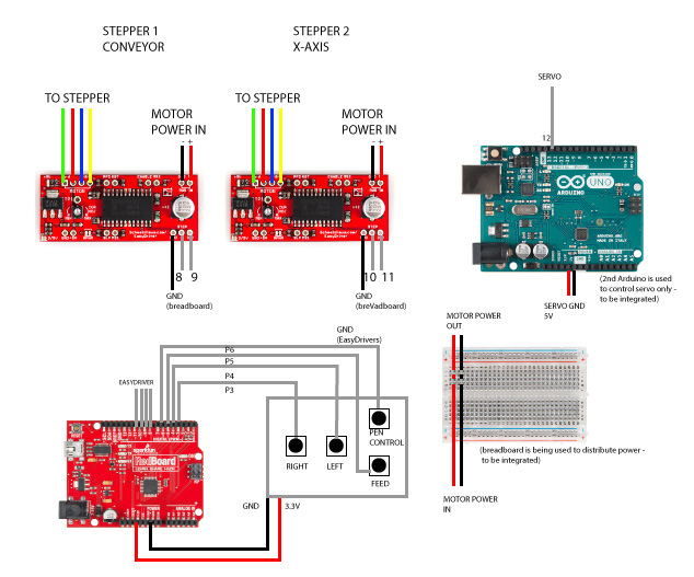 It was so satisfying to see our machine take shape but we were still only half way there. Now was time to work on the electronics and the coding. I made some diagrams to get a sense of what maybe this machine is capable of. We did not really use this diagram as we essentially never quite made it to such a testing phase. That would be possible if it was a 3 week assignment. I did what I could to help move us along by working on getting our machine up and running with Arduinos and Sparkfun Easy Drivers so that Marc could do the integration and, if possible, add his nicer electronics and finishing touches. We were so rushed and tired near the end that we lost a bit of our organizational effectiveness and things were a bit more complicated than they should have been but I think we managed nicely. Here are the items I worked on:
