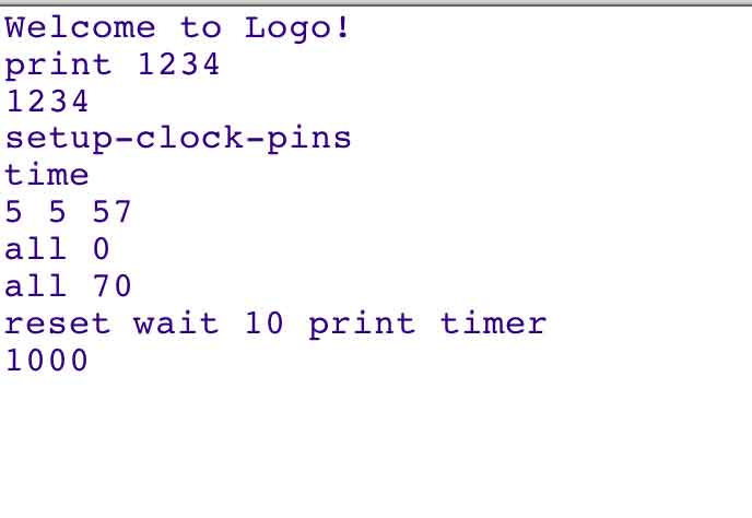 I would have really liked to demonstrate Logo with motors and a variety of sensors. I feel I could have been further along in this regard. I would have prefered to have a variety of input and output boards and demonstrate how they can be integrated.