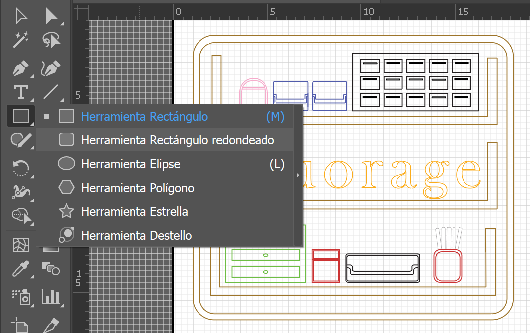 in the sidebar are the drawing tools, one of which most used is the tool of geometric shapes such as the square, circles, rounded square.