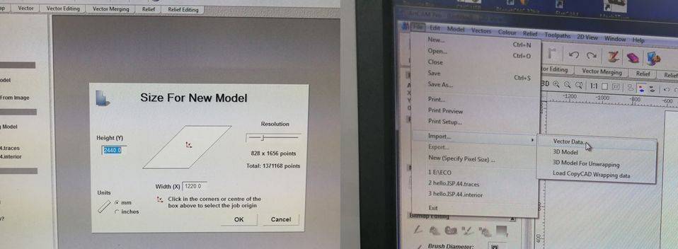 We opened artcam to prepare the gcode file. We indicate the size of the MDF plate and then import the vector file that was extracted from the slicer program.