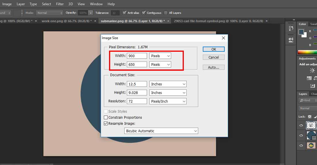From the menu bar select image then image size. A window will appear in which we can change the image size