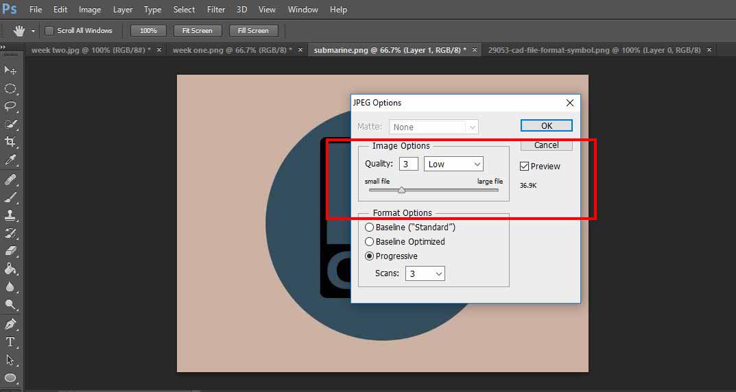 select file from menu bar then save as JPEG, A window will appear in which we can control the size of the image