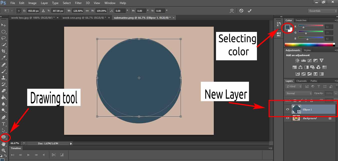 All items in photoshop are broken into layers. To deal with an item whether it's an image, Text, Shape or any other thing,it must be activated by clicking on it one time in the layers section. Any change made is made on the activiated layer.