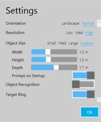 Settings for 3D scanning. The conditions of the scanner can be varied: rotation, resolution, object size, etc.