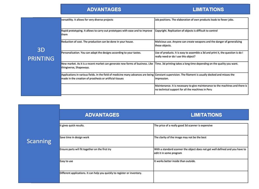 In the following table you can see the advantages and limitations of 3D printing and 3D scanning. I believe that both technologies are still in the process of improvement and diffusion. Both technologies require the development of more precise and sophisticated machines. Source.