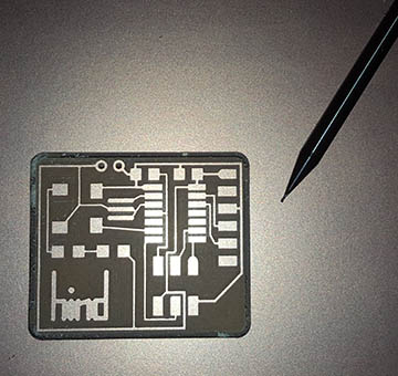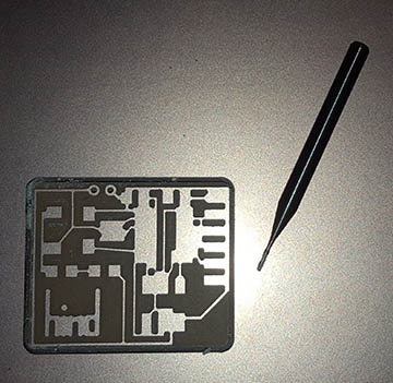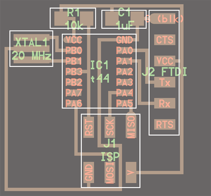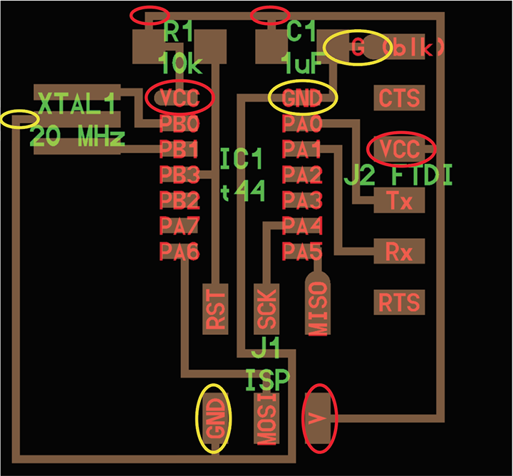 - Touching paths of the crystal: When I milled my board, neither the 1/32” or the 1/64” were precise enough to disconnect the lower traces of the Crystal. The GND connection of the Crystal was connected to PB1 of the MC. I thought of redoing my board all together, but I ended up manually disconnecting the copper on the two pads with an exactor knife.