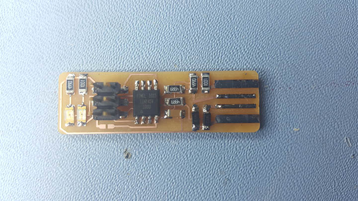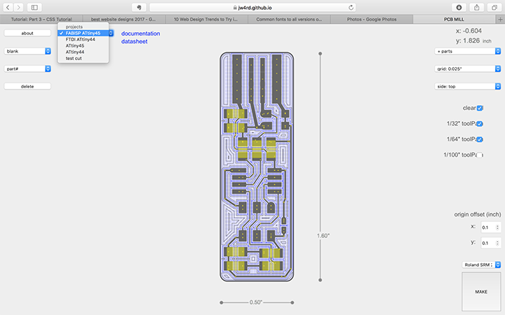 Last time I worked with electronics was in 2009! This +200 min tutorial was a life saver when it comes to remembering the basics with a x1.25 speed. I highly recommend spending the time to go through them before even checking Ali page on the FabISP. Once I got my basics down, I used ShieldMill- Jonathan Ward's app on Github- to print my circuit board. What is super cool about his ShieldMill app is that it has the FabISP ATtiny45 circuit board already designed for you (under projects). It is also two clicks away from generating both the Gcode and the PNG needed to use your local Roland Mill. The process is as follows: