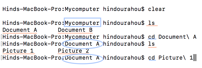 Example: Let’s imagine I have only 2 documents in my entire computer “Document A” and “Document B”. “A” is where I keep two of my favorite pictures “Picture 1” and “Picture 2”. And “B” is where I keep two of my favorite songs “Song 1” And “Song2”. By typing the command “ls” in the terminal and hitting the enter key, the terminal will list all documents in my computer. In this case: “Document A” and “Document B”. If I want to open "Picture 2", I will need to use the “cd” command to enter into “Document A”, listing all of its content, then opening “Picture 2”. In the terminal this process will look like the following.