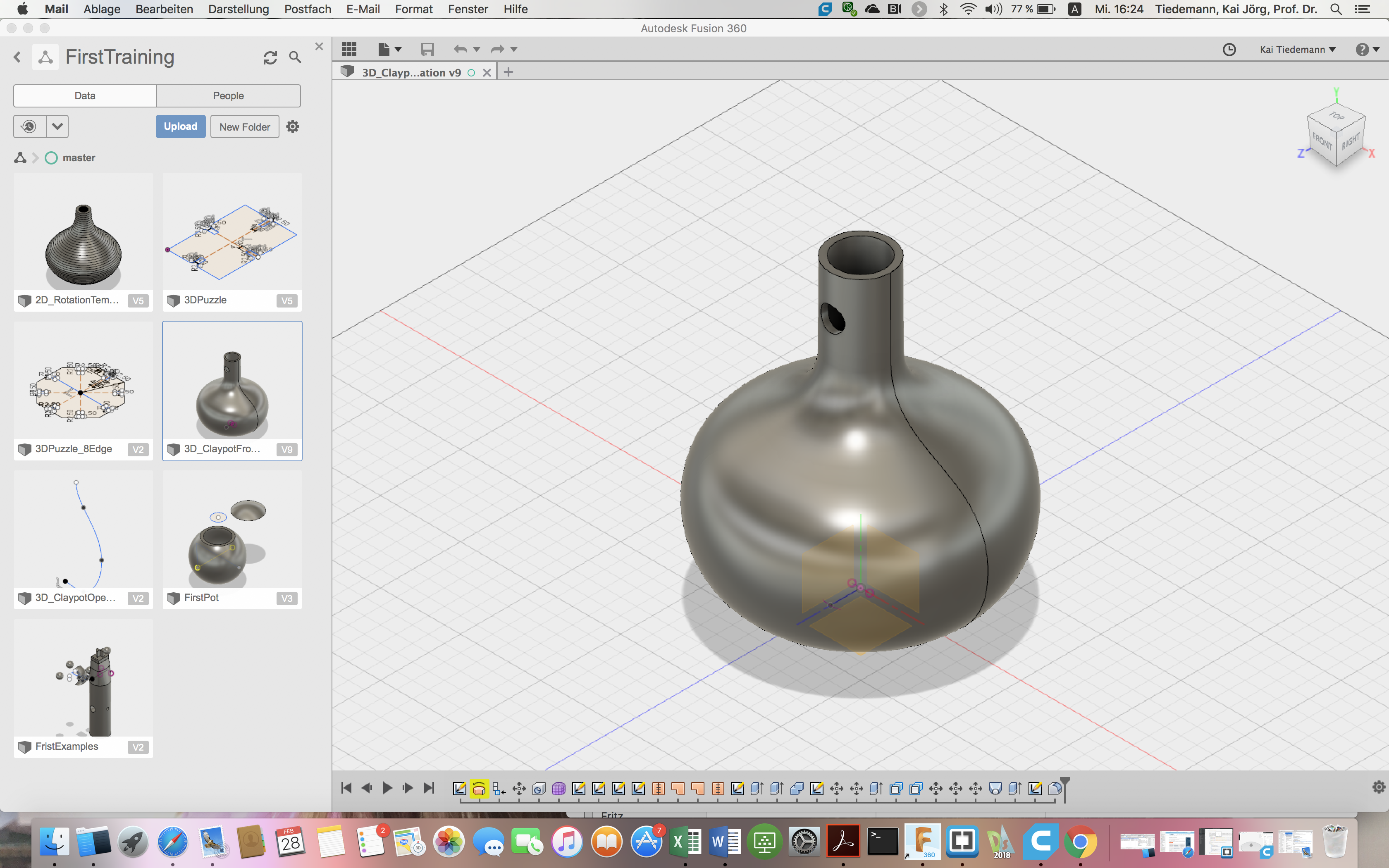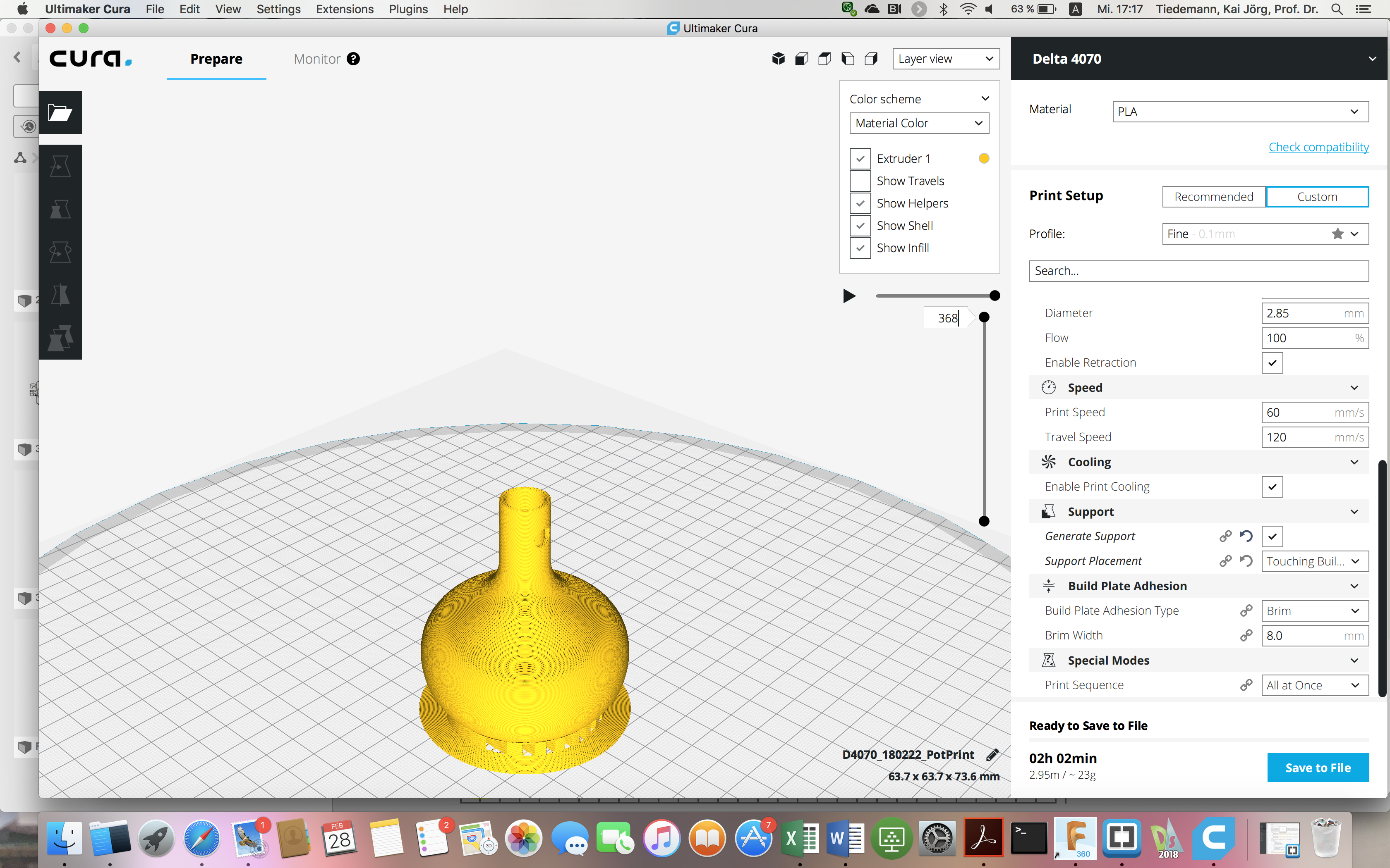 For my individual assignment I chose printing a downscaled model of the vases I want to print in clay for my final project. I took the design from my week03-assignment on Computer-Aided Design in Fusion360 (Fig.01), since this is a simple (hence supposedly uncomplicated to print) object, which at the same time displays the requested feature that it cannot be produced subtractively. This refers to the processing of a workpiece in a conventional mill: an object that is produced subtractively can only be worked on from the top, hence there is no way to carve voids with overhanging structures - unless the facility is operating a 5-axis device, which is not the case in Kamp-Lintfort. The design was delivered from Fusion360 to Cura as a .stl-file (Fig.02).