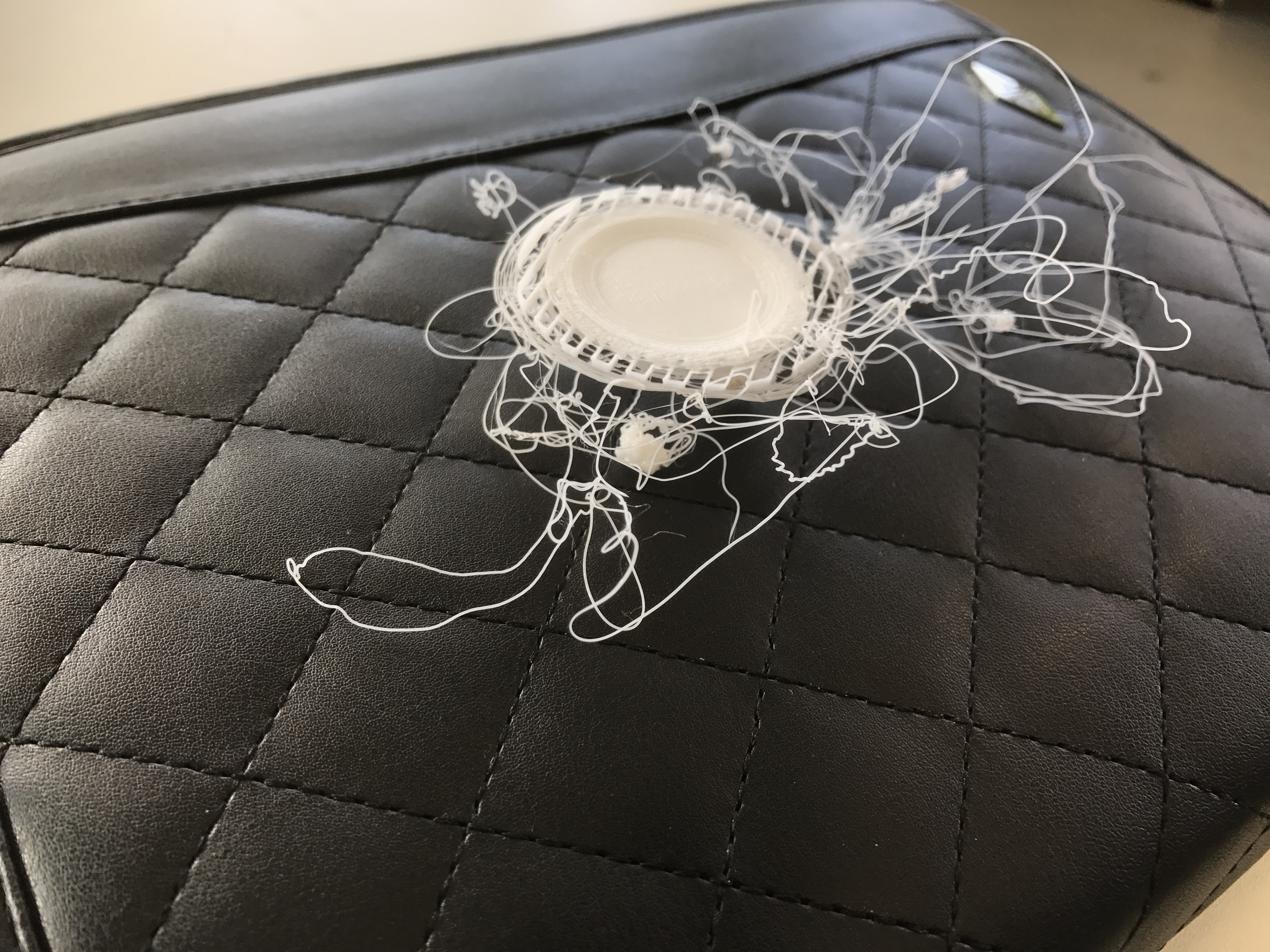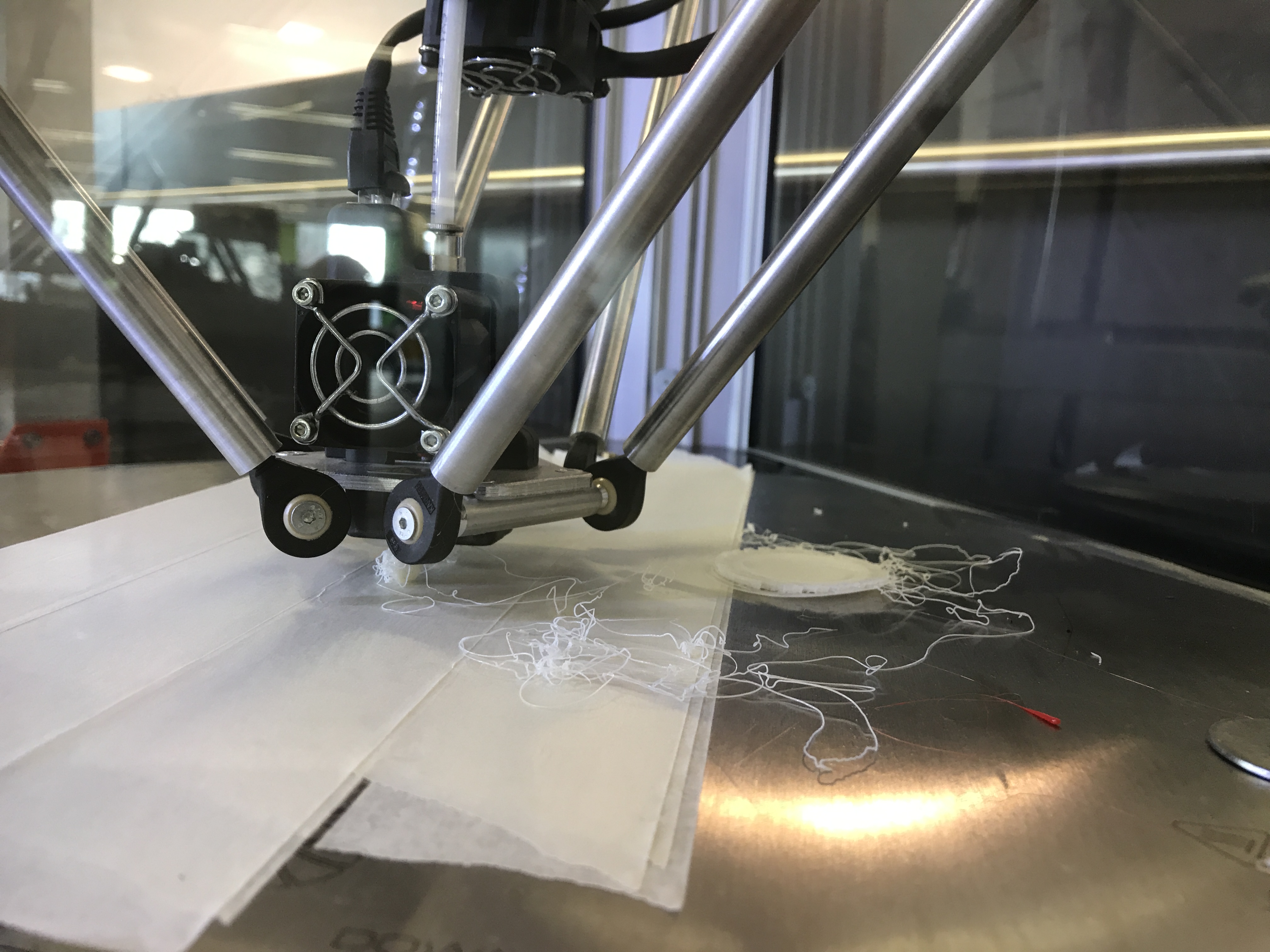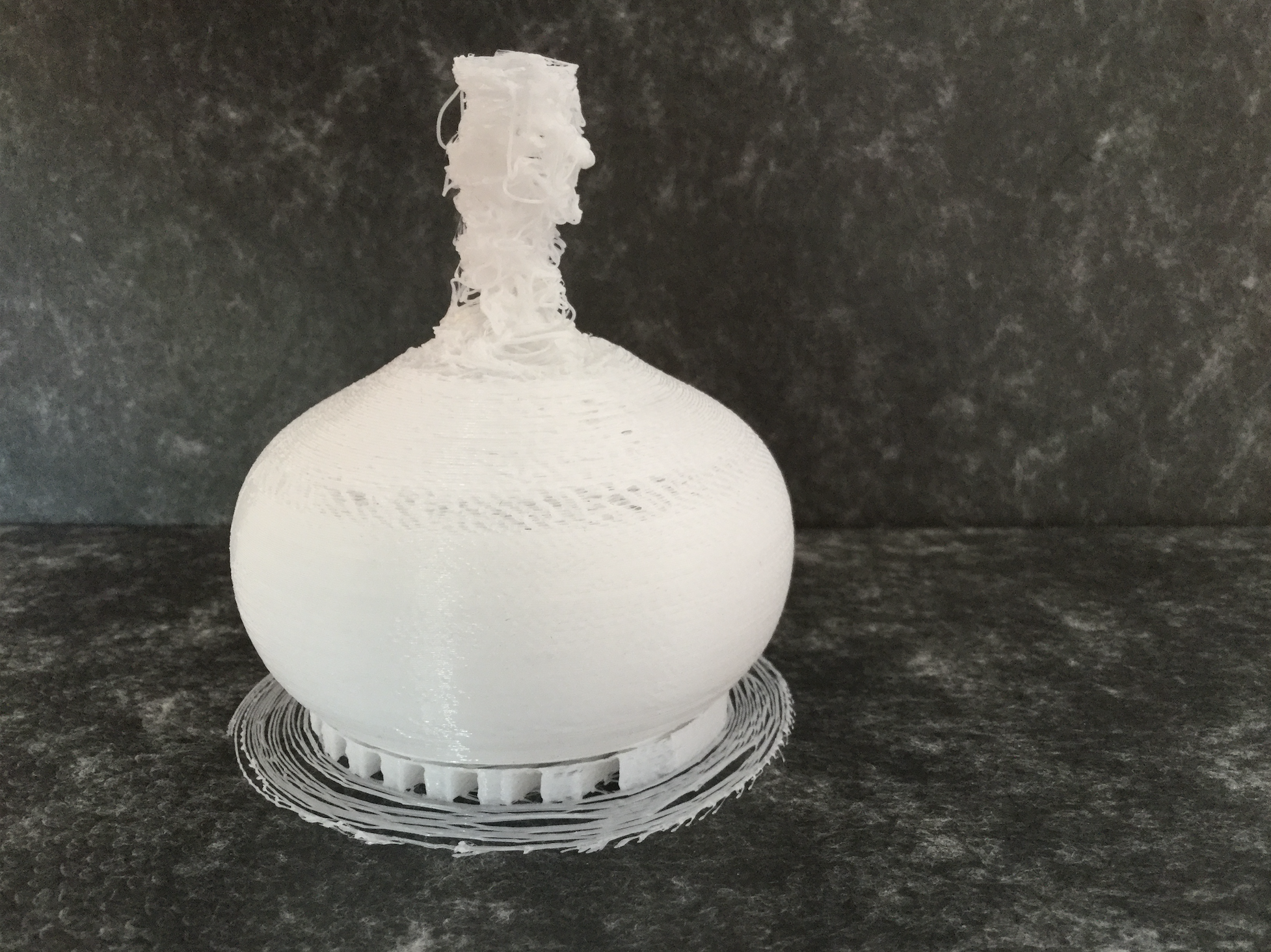 The printer's base plate was prepared with adhesive tape (Fig.03). Unfortunately, the settings did not work very well with the Delta Printer, Fig.04 & 05 show the initial mess. The outcomes improved slightly after increasing the printing temperature manually on the printer to 215°C (Fig.06), still the vase's neck did not come out (Fig.07). Finally, switching the printer to an Ultimaker 2+ Extended with a 0.8mm nozzle did the job after changing the width of the wall from 0.8mm to 2.5mm (Fig.08).