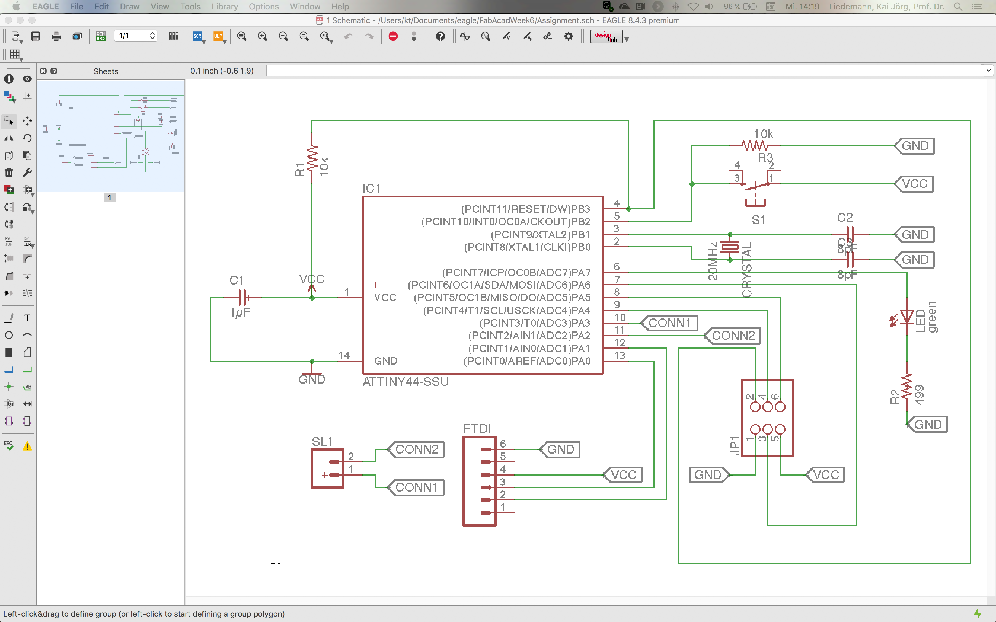 This brought me to designing my first board in Eagle. Eagle's functionalities are quite comprehensible, offering an easier approach than Fusion360. To work the re-design assignment, it was necessary to download some libraries, each of which containing a set of up to hundreds of components as symbols, sketches, including the corresponding properties. Those libraries often come in ZIP files which need to be extracted, then copied into the lbr folder in Eagle. The libraries must be activated for use by opening the library manager, then clicking the Browse.. button and selecting the desired library from the catalog of the lbr folder.